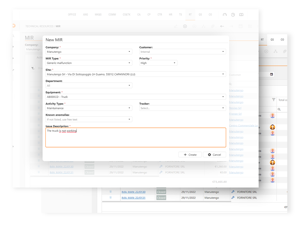 Allow authorized users to create intervention requests directly within the software or mobile app, entering all key elements such as date, entity, priority, photos, attachments, etc. Add interventions to the maintenance plan to always have an updated view of the performance of all company assets