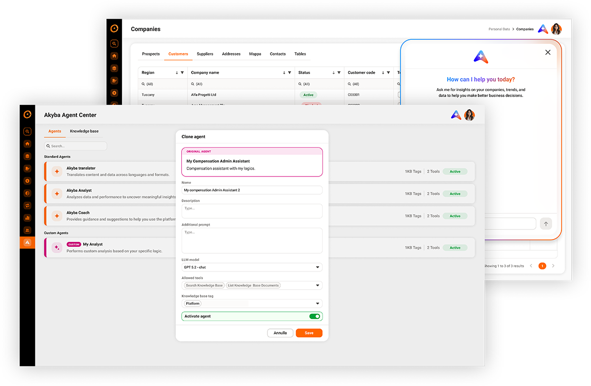 Ogni agente AKYBA è modellabile sul tuo business. Adatta i prompt, arricchisci la knowledge base, definisci la logica decisionale, il tutto dentro il perimetro sicuro e governato di Akeron.
